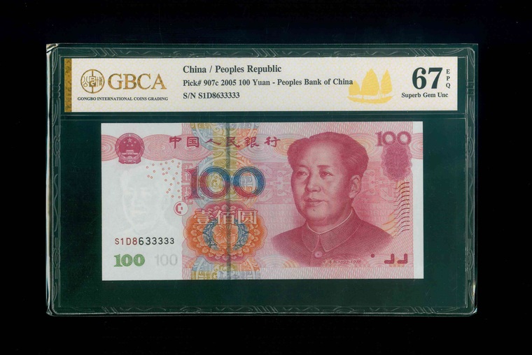 2005 中國人民銀行 $100 GBCA 67 EPQ 編號: S1D8633333(頂級雪白)