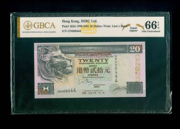 1998 香港上海滙豐銀行 $20 GBCA 66 EPQ 編號: GN000444(雙豹號,頂級雪白)