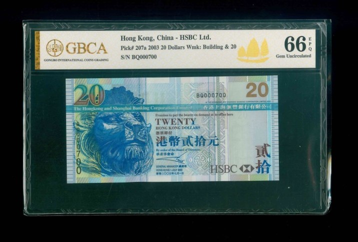 2003 香港上海滙豐銀行 $20 GBCA 66 EPQ 編號: BQ000700(700號,頂級雪白)