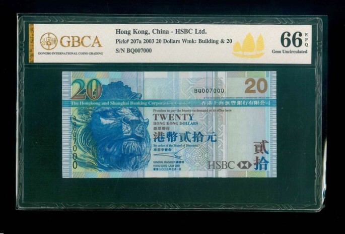 2003 香港上海滙豐銀行 $20 GBCA 66 EPQ 編號: BQ007000(7000號,頂級雪白)