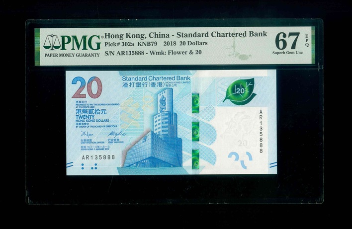 2018 香港渣打銀行 $20 PMG 67 EPQ 編號: AR135888(豹子號,頂級雪白)
