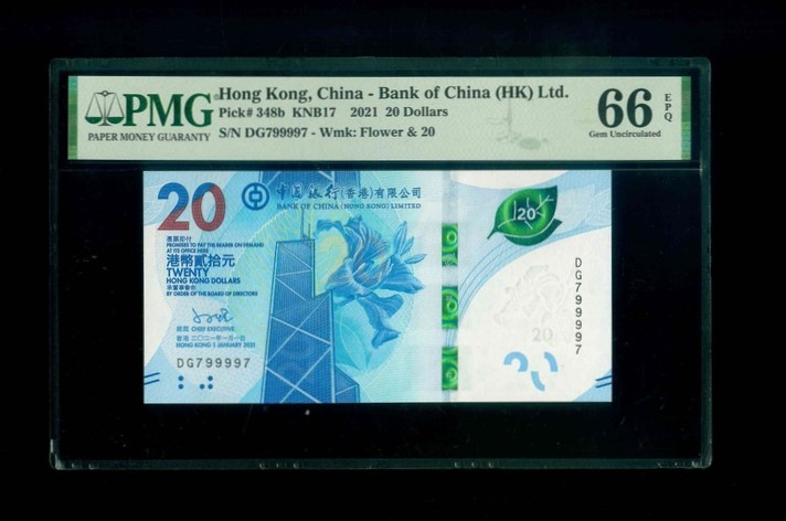 2021 香港中國銀行 $20 PMG 66 EPQ 編號: DG799997(雷達號,頂級雪白)