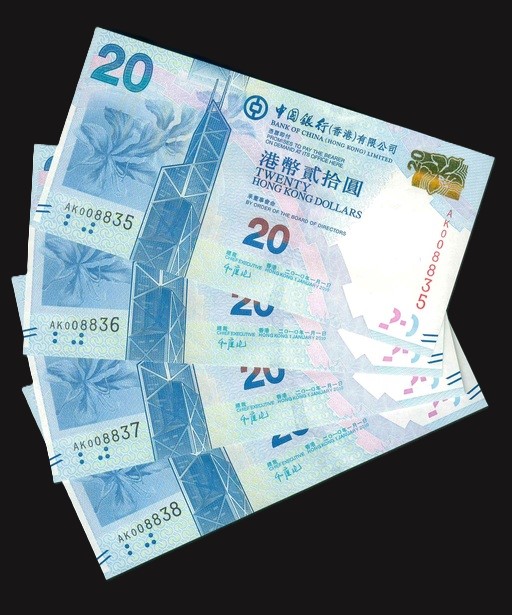 2010 香港中國銀行$20 UNC 編號: AK008835-838(連號,頂級雪白,共4張)