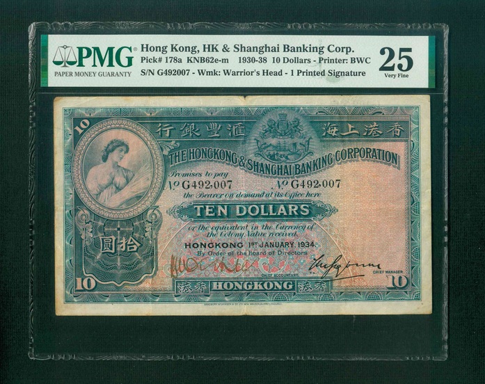 1934 香港上海滙豐銀行 $10 PMG 25 編號: G492007
