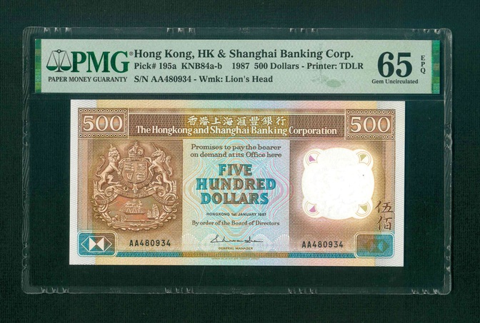 1987 香港上海滙豐銀行 $500 PMG 65 EPQ 編號: AA480934(頭版系列,頂級雪白)