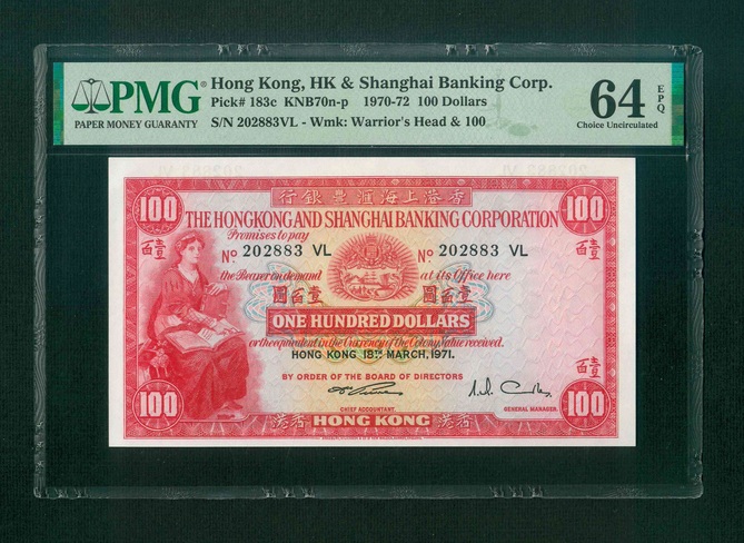1971 香港上海滙豐銀行 $100 PMG 64 EPQ 編號: 202883 VL(頂級雪白)