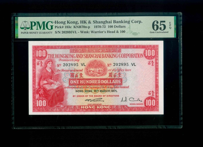 1971 香港上海滙豐銀行 $100 PMG 65 EPQ 編號: 202895 VL(頂級雪白)