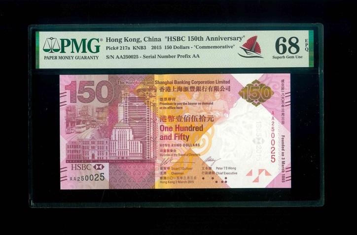 2015 香港上海滙豐銀行紀念鈔 $150 PMG 68 EPQ 編號: AA250025(頂級雪白)