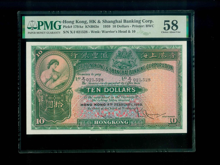 1959 香港上海滙豐銀行 $10 PMG 58 編號: X/J 021528