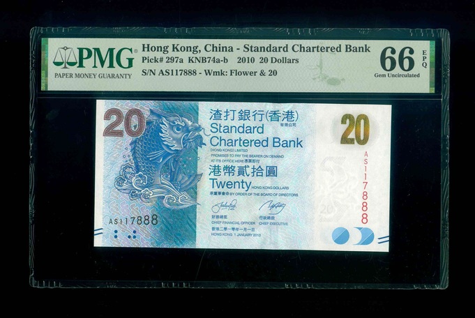 2010 香港渣打銀行 $20 PMG 66 EPQ 編號:AS117888(豹子號,頂級雪白)