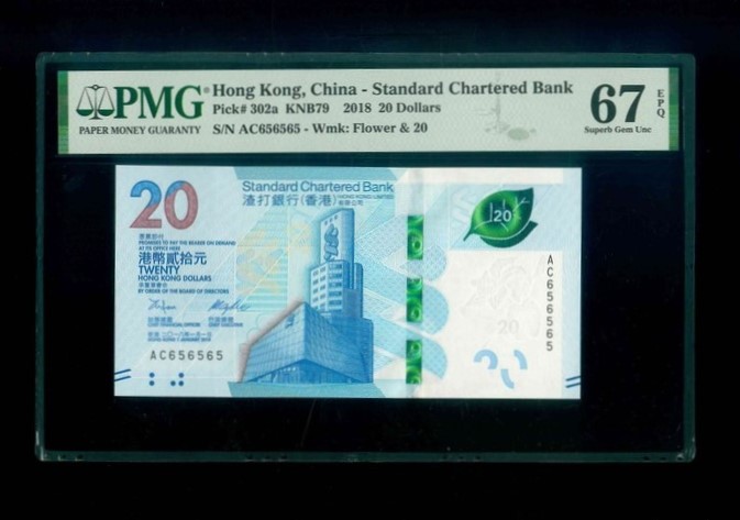 2018 香港渣打銀行 $20 PMG 67 EPQ 編號:AC656565(重複號,頂級雪白)