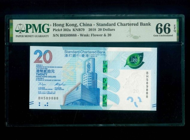 2018 香港渣打銀行 $20 PMG 66 EPQ 編號:BH589888(豹子號,頂級雪白)