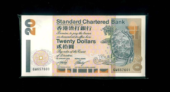 2002 香港渣打銀行 $20 UNC 編號:GW657601-700(標準百連,頂級雪白)