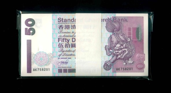 2001 香港渣打銀行 $50 UNC 編號:AK758201-300(標準百連,頂級雪白)
