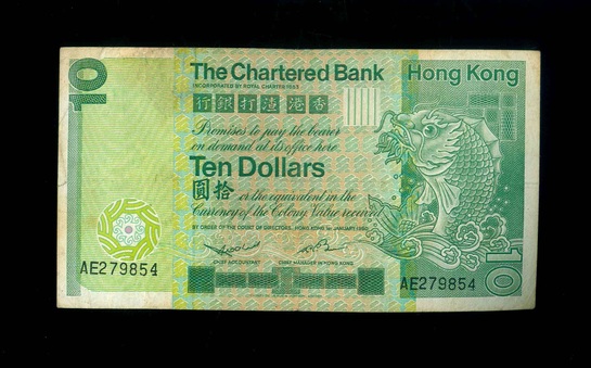 1980 香港渣打銀行 $10 VF 編號:AE279854(錯體-左邊編號上移)