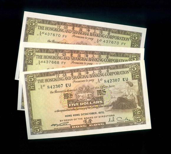 1972/1975 香港上海滙豐銀行 $5 EF-AU 編號:842307 EU…(共3張,趣味品,圖案上下移位)