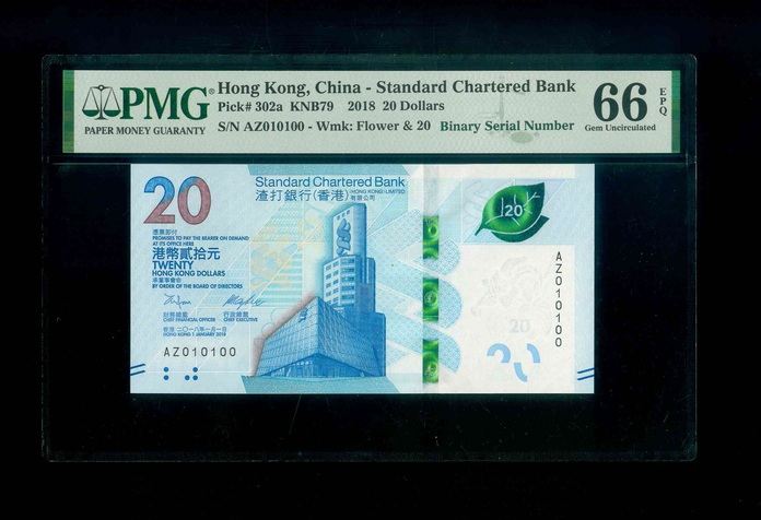 2018 香港渣打銀行 $20 PMG 66 EPQ 編號:AZ010100(二進制,頂級雪白)