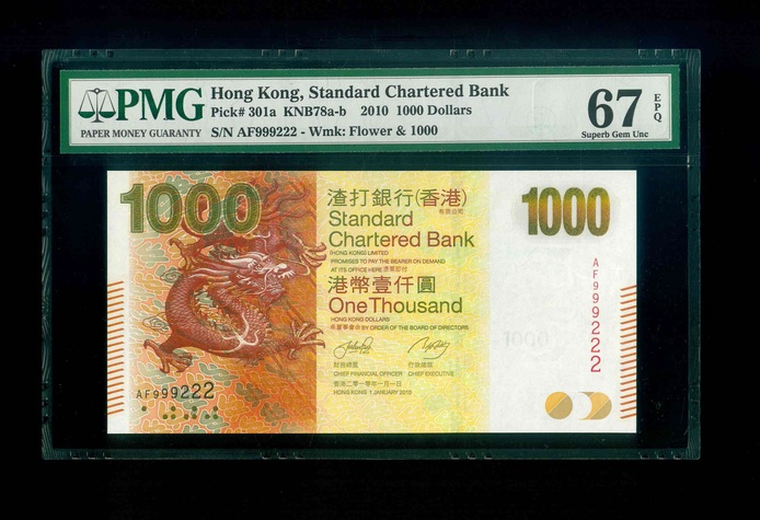 2010 香港渣打銀行 $1000 PMG 67 EPQ 編號:AF999222(雙豹號,頂級雪白)