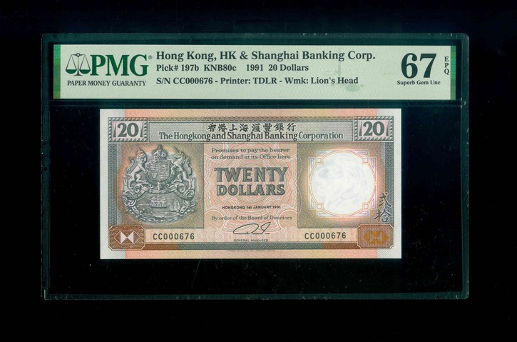 1991 香港上海滙豐銀行 $20 PMG 67 EPQ 編號:CC000676(頂級雪白)
