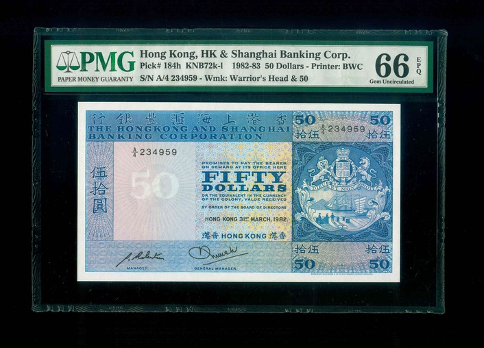 1982 香港上海滙豐銀行 $50 PMG 66 EPQ 編號:A/4 234959(頂級雪白)