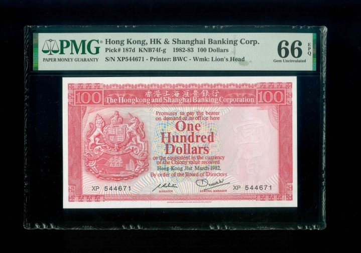 1982 香港上海滙豐銀行 $100 PMG 66 EPQ 編號:XP 544671(頂級雪白)