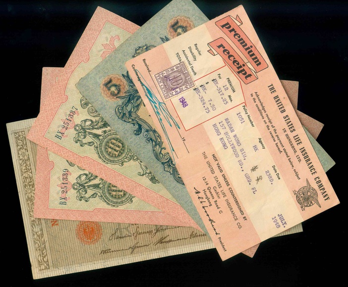 1909-1948 俄羅斯帝國時期 5,10盧布/ 德國 1000 Mark/ 美國人壽保險公司收據 品相如圖 編號:YA-110…(共5張)