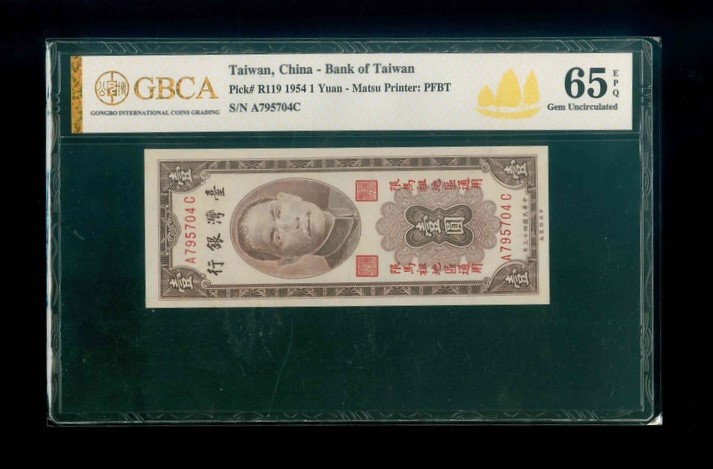 1954 台灣銀行 $1 GBCA 65 EPQ 編號:A795704C(加蓋馬祖通用,頂級雪白)