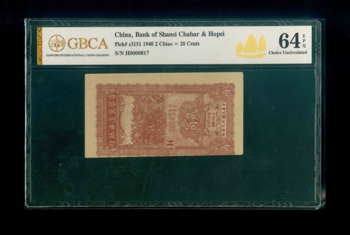 1940 中華民國晉察冀邊區銀行 2角 GBCA 64 EPQ 編號:H0000817