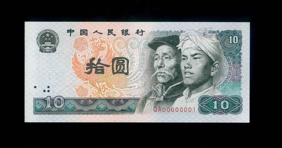 1980 中國人民銀行 $10 AU 編號:QA00000001(趣味改號,工藝品)