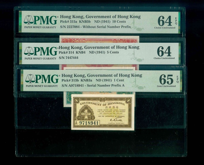 1941ND 香港政府 壹仙 伍仙 壹毫 PMG 64-65 EPQ 編號:A9718941…(共3張)