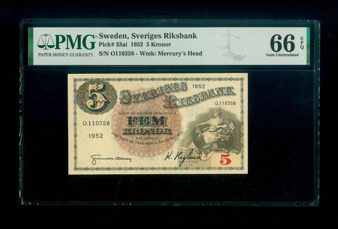 1952 瑞典 5 Kronor PMG 66 EPQ 編號:0110358(頂級雪白)