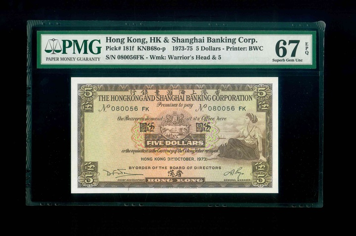 1973 香港上海滙豐銀行 $5 PMG 67 EPQ 編號:080056 FK(少有騎版,頂級雪白)