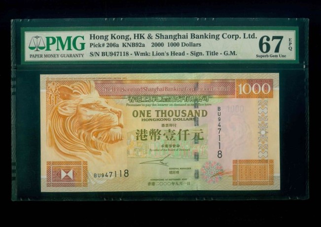 2000 香港上海滙豐銀行 $1000 PMG 67 EPQ 編號:BU947118(千禧回收版,頂級雪白)