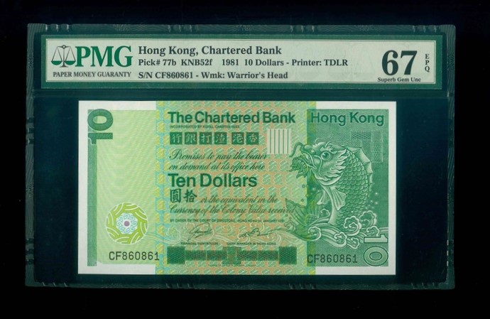 1981 香港渣打銀行 $10 PMG 67 EPQ 編號:CF860861(頂級雪白)