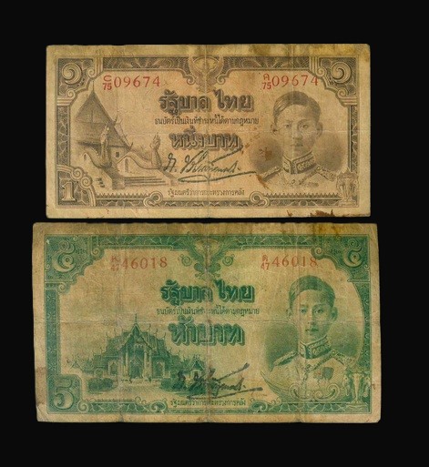 1942-1944 泰國 1, 5 baht VF-F 編號:C75 09674…(共2張)