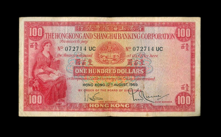 1959 香港上海滙豐銀行 $100 VF+ 編號:072714 UC