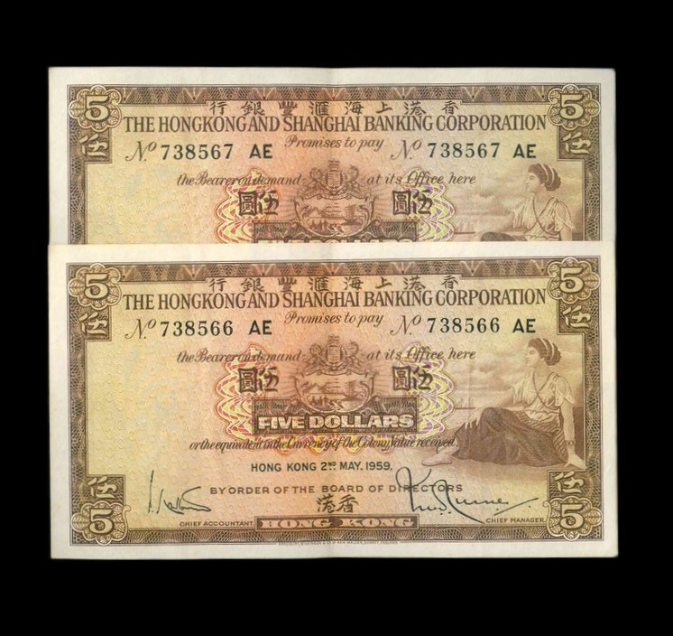 1959 香港上海滙豐銀行 $5 EF+ 編號:738566-67 AE(共2張,連號)