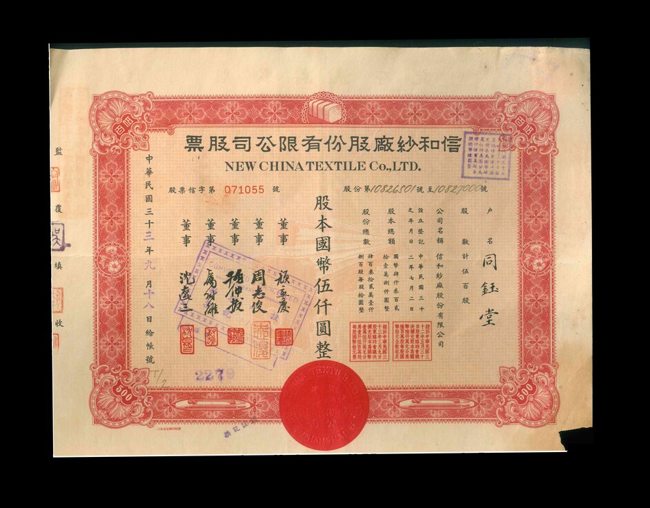 1944 中華民國33年信和鈔廠股本國幣伍仟圓整 品相如圖 編號:071055(缺角,自行決定)