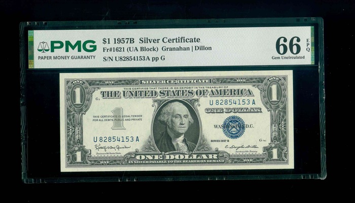 1957B 美國$1 PMG 66 EPQ 編號: U82854153A(頂級雪白)