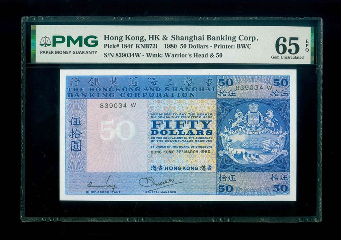 1980 香港上海匯豐銀行$50 PMG 65 EPQ 編號: 839034W