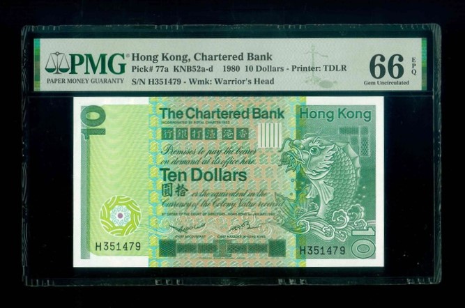 1980 香港渣打銀行 $10 PMG 66 EPQ 編號:H351479(頂級雪白)
