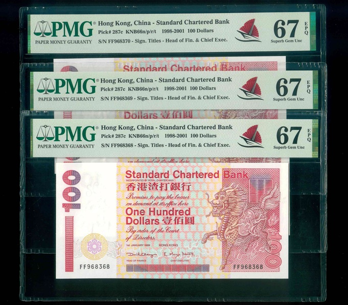 1999 香港渣打銀行 $100 PMG 67 EPQ 編號:FF968368-70(共3張,雙冠連號,頂級雪白)