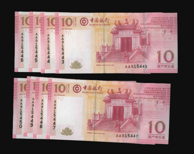 2008 澳門中國銀行 10 Patacas UNC 編號:AA915443-50(共8張,頭版連號,頂級雪白)