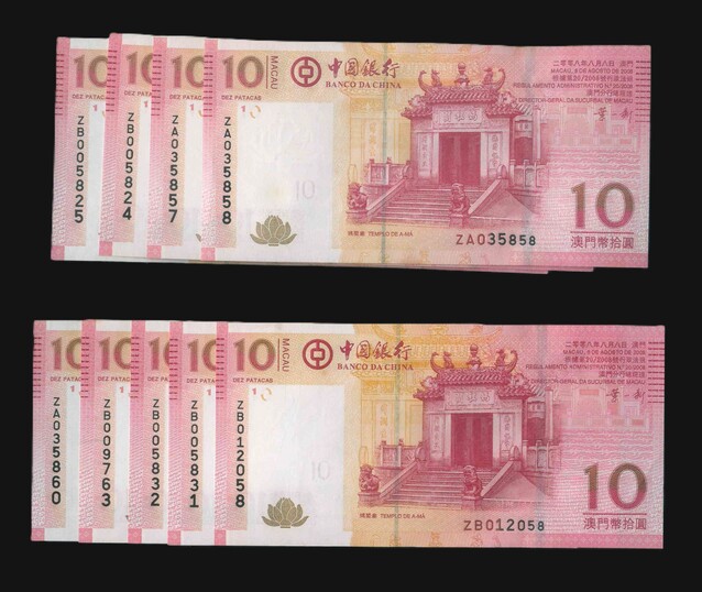 2008 澳門中國銀行 10 Patacas AU-UNC 編號:ZA035858...(共9張,含連號)