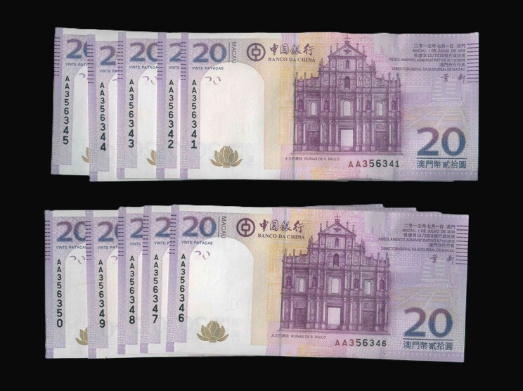 2013 澳門中國銀行 20 Patacas UNC 編號:AA356341-50(共10張,頭版連號,頂級雪白)