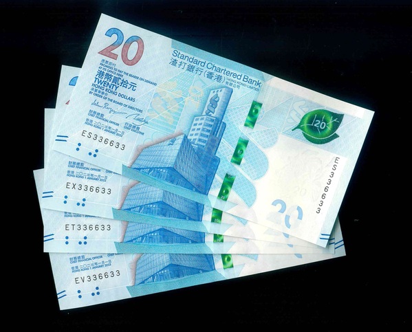2023 香港渣打銀行 $20 UNC 編號:ES/EX/ET/EV 336633(共4張,雷達同號三對子,頂級雪白)