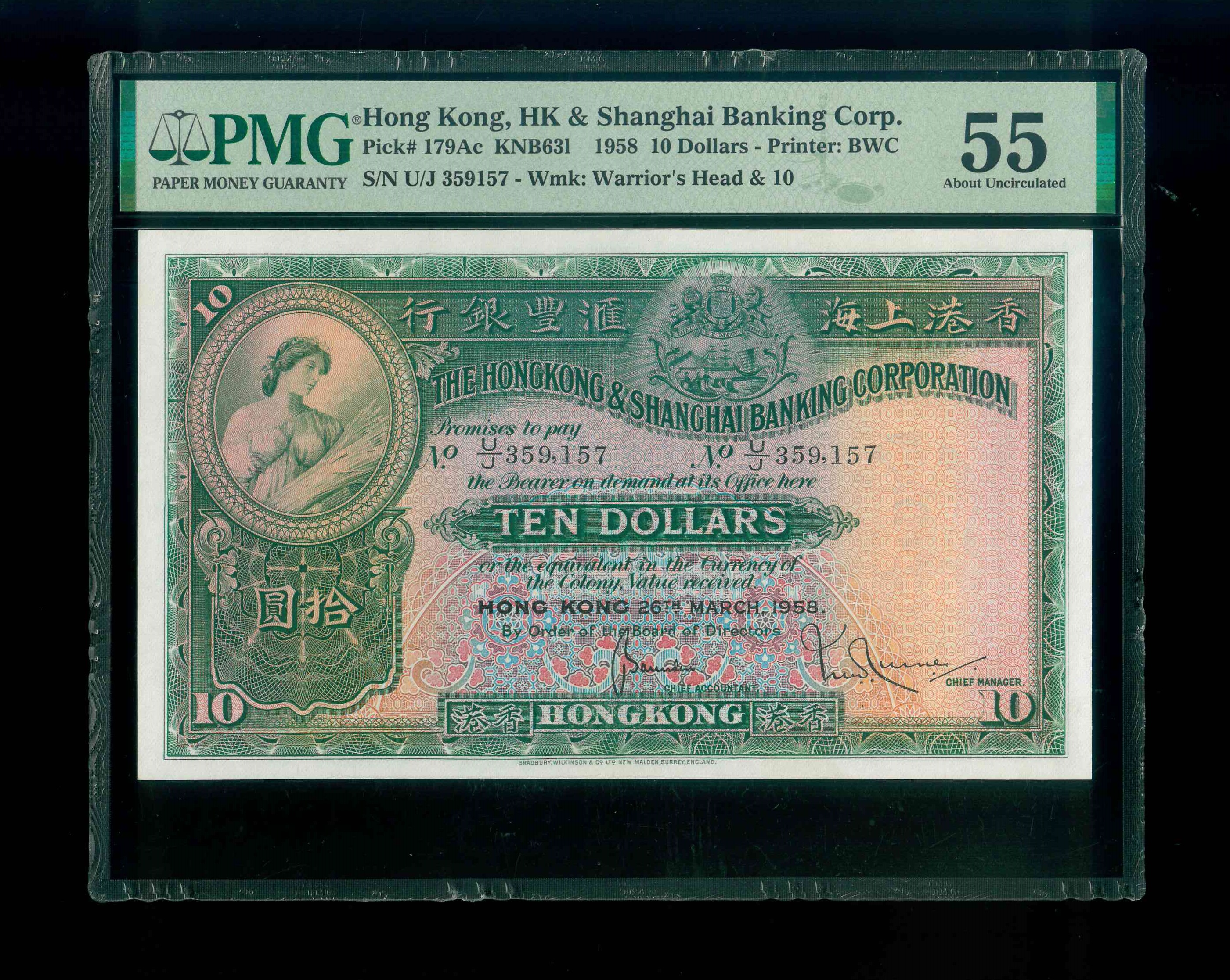 1958 香港上海滙豐銀行 $10 PMG 55 編號:U/J 359157(紙胆系列)