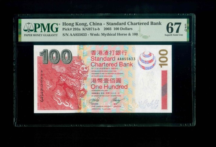 2003 香港渣打銀行 $100 PMG 67 EPQ 編號:AA855633(頭版系列,頂級雪白)