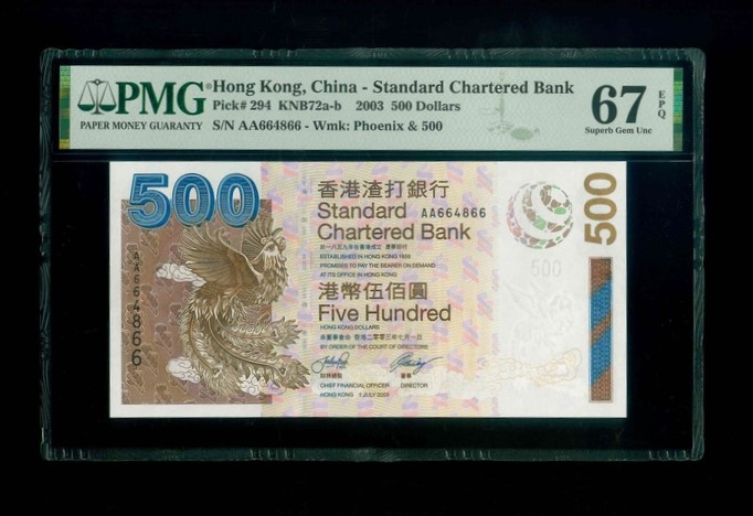 2003 香港渣打銀行 $500 PMG 67 EPQ 編號:AA664866(頭版系列,頂級雪白)