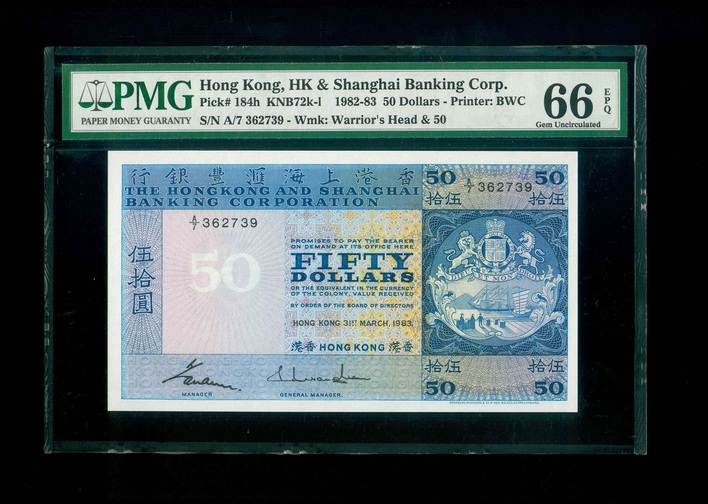 1983 香港上海滙豐銀行 $50 PMG 66 EPQ 編號:A/7 362739(頂級雪白)